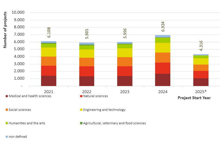 FRIS comprises a growing number of research projects of the Flemish knowledge institutions. In 2024 nearly 7000 newly started projects were reported. Most of them are situated in the fields of Natural sciences and Medical and health sciences (each 23%). The Social sciences and Engineering and technology are equally strongly represented (20%). The Humanities and the arts (10%) and Agricultural, veterinary and food sciences (4%) account for the remainder of the projects. About 1% of the projects had no science disciplines assigned to them. The figures for 2025 are interim results (31/10/2025). Look in detail...