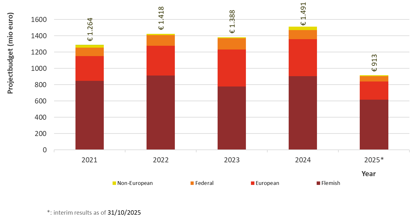 Institutions provide information to FRIS on publicly funded research. The projects listed in FRIS are mainly financed by the Flemish government (63%). 28% of the budget comes from Europe, about 8% comes from the federal government. Altogether these projects represent a yearly budget of more than 1,5 billion euros in 2024. Look in detail...